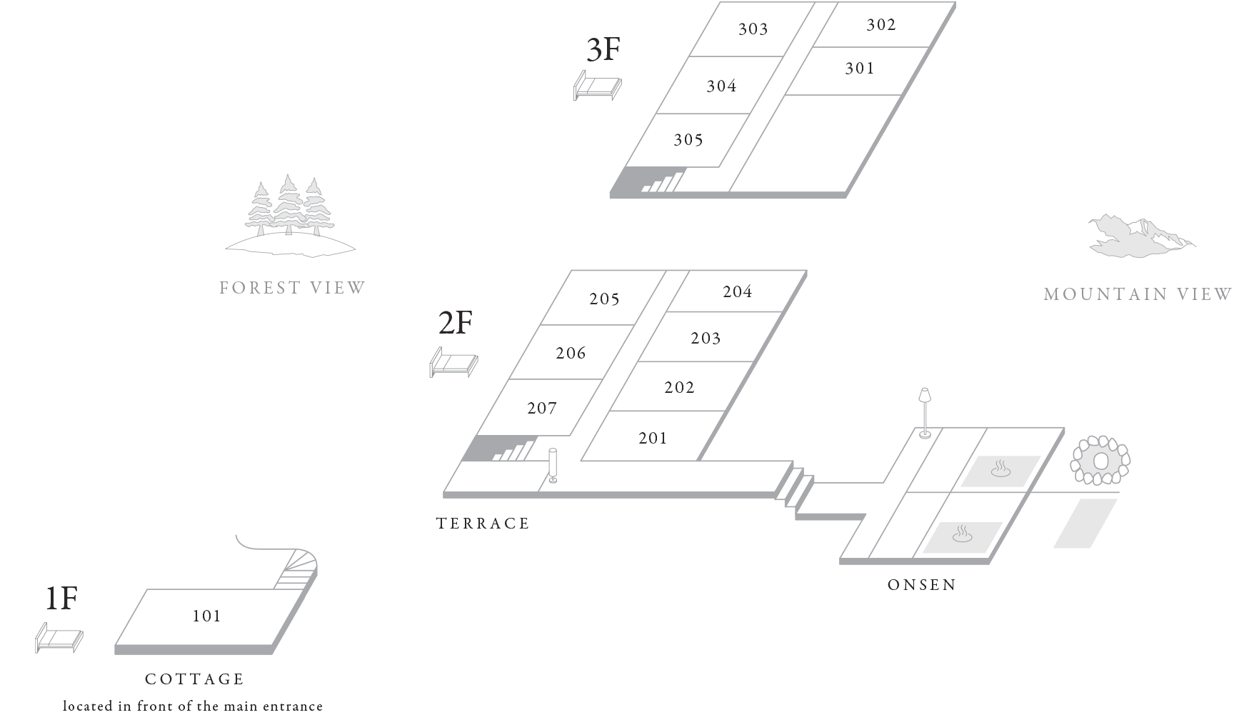 Along with Room 202, Room 301 offers the best view of the mountain from its expansive window. This combined with the vaulted ceiling adds a sense of openness that make this room our most popular. You can enjoy the scenery from the balcony or the open-air bath. The glow of the morning sunrise against the mountains is especially breathtaking. Check your room guide or ask our staff for the time of the sunrise.